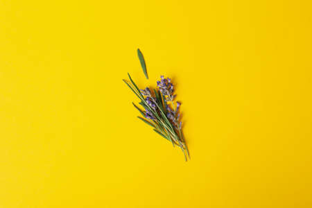 Lavender flowers and rosemary on yellow background