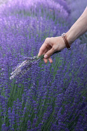 Woman's hand holding a bunch of lavender flowers on the background of a lavender field.