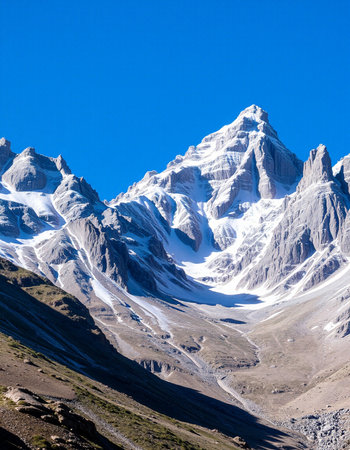 Mountain landscape with snow and clear blue sky. View of the mountain peaks.