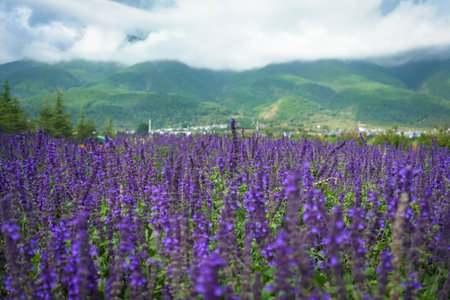 Colorful violet or purple lavender flower in field garden with dark forest tone.