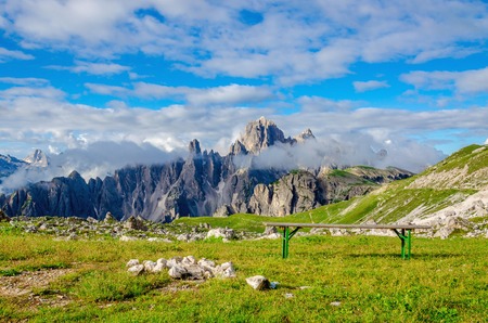 Mountainous landscape with clouds in Three Peaks Nature Park in Italian dolomite Alps, Sesto Dolomites in South Tyrol