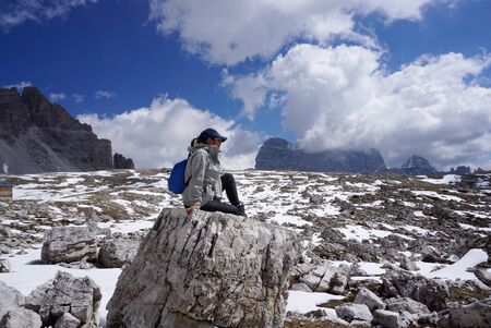 Female trekker sitting on the rock with beautiful landscape background in Dolomite, Italy