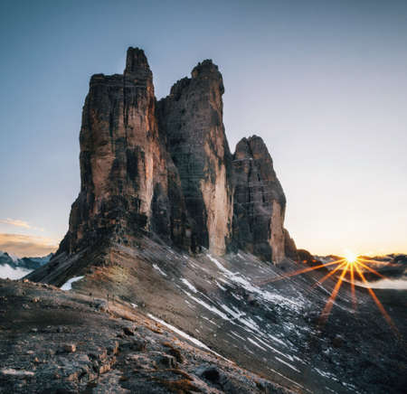 Incredible view of the Three Peaks of Lavaredo on sunset time