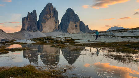 A woman enjoying the sunset over the Tre Cime di Lavaredo (Drei Zinnen) mountains in Italian Dolomites. The peaks reflect in a paddle. The mountains are surrounded with orange and pink clouds. Freedom