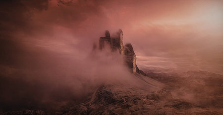 A striking landscape featuring a rugged mountain peak shrouded in a thick, crimson-hued mist. The scene is bathed in warm, reddish light, creating an ethereal and otherworldly atmosphere.