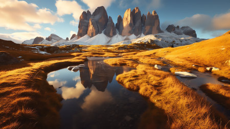 A panoramic view on the famous Tre Cime di Lavaredo (Drei Zinnen), mountains in Italian Dolomites. The mountains are reflecting in small paddle. Desolated and raw landscape. Natural phenomenon