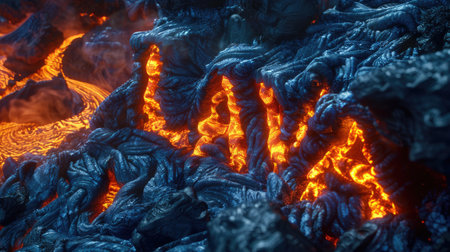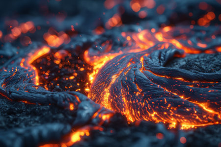 Close-up view of glowing molten lava flowing over dark rock, creating intricate patterns. Represents intense heat, power, and natural forces. Ideal...