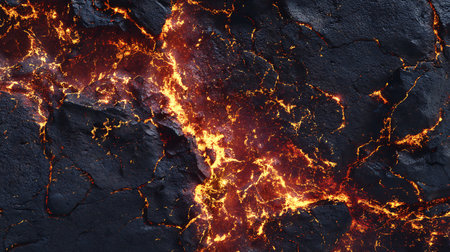 Fiery digital artwork in a dramatic style with intense orange luminescence piercing dark volcanic expanses, capturing raw primal energy through stylized heat waves and molten contours. Perfect for dynamic wallpapers, gaming interfaces, sci-fi posters, environmental campaigns, and abstract textures in design projects. Versatile for creative industries seeking ... AI-generated digital illustration. AI-generated illustration.