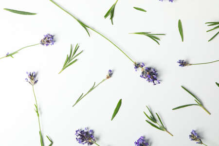 Lavender flowers arranged on white table background. Top view, flat lay mock up, copy space. Background concept. Flower Floral composition.