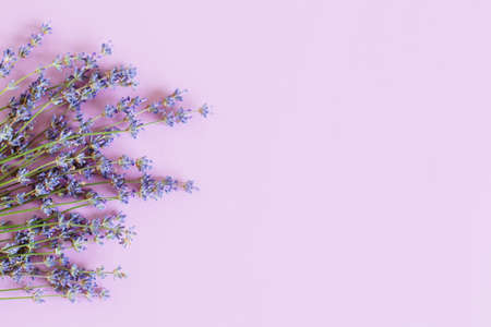 Purple lavender flowers are arranged on pink background. Flat lay, top view. minimal concept.