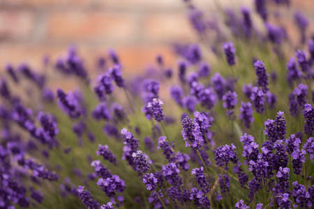 Soft focus image of blooming lavender flowers in summertime Against the backdrop of a brick wall.