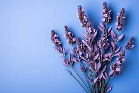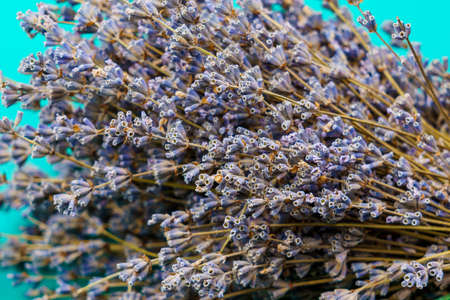Lavender flower bouquet on a blue background, a bunch of lavandula plants in bloom