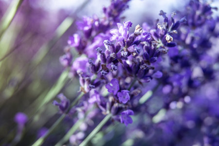 Lavender flower macro close up, selective focus in the garden with blurred bokeh