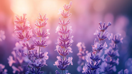 Close-up of blooming lavender flowers bathed in warm, soft sunlight, creating a serene and dreamy atmosphere with purple and pink hues.