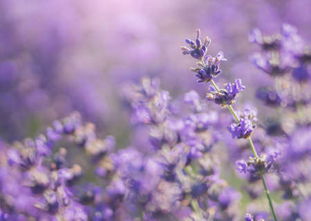 Lavender flower background. Violet lavender field sanset close up. Lavender flowers in pastel colors at blur background. Nature background with lavender in the field.