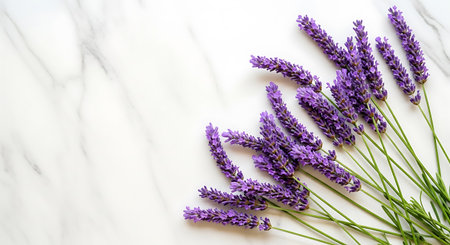 Fresh lavender flowers are beautifully displayed on a white marble surface adding tranquility.