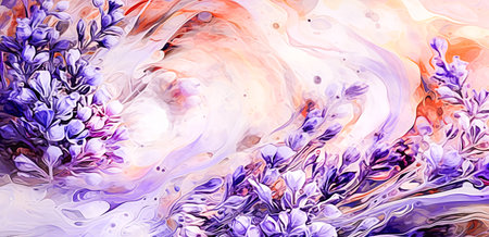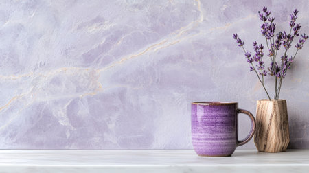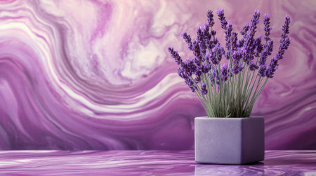 A stunning lavender bouquet in a sleek purple pot stands against a swirling abstract marbled background, capturing a serene and vibrant atmosphere perfect for home decor inspiration.