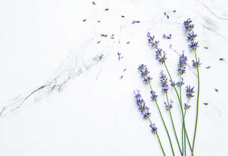 Lavender flowers on white marble background. Top view, flat lay, copy space
