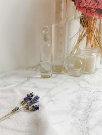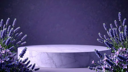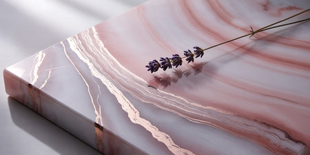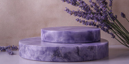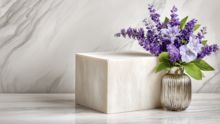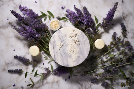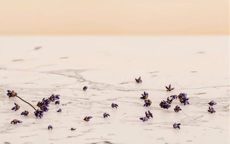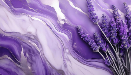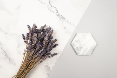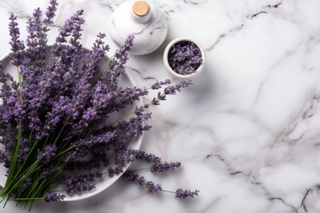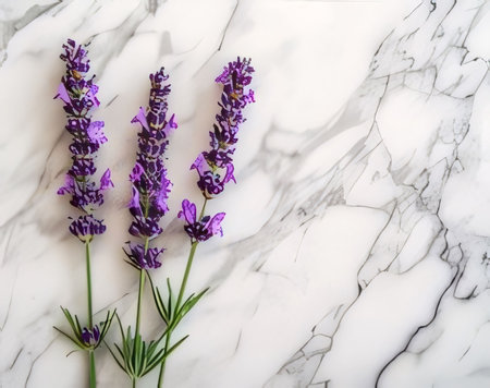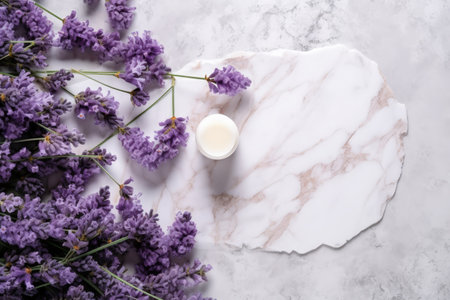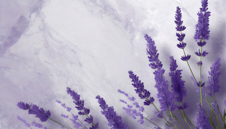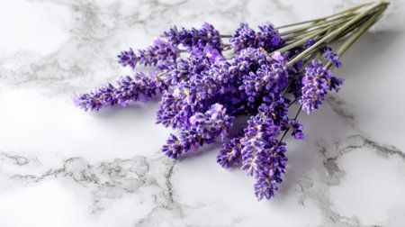 Freshly cut lavender adds a soothing touch to the elegant marble background creating tranquility.