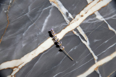 A delicate sprig of dried lavender lies diagonally across a luxurious grey marble surface. The stone features prominent white veining with subtle golden accents, creating a sophisticated and natural pattern.