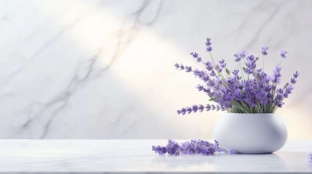 lavender blossoms showcased in a flower pot, elegantly positioned on a white marble table, set against a modern minimalist background with open space for text or invitations