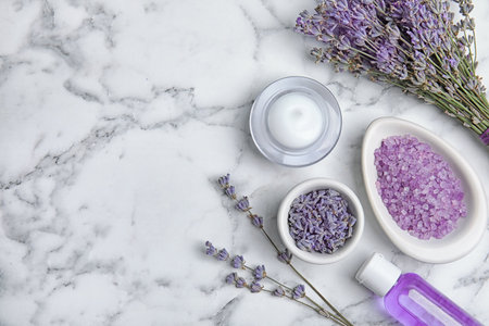 Flat lay composition with lavender flowers and natural cosmetic products on marble background