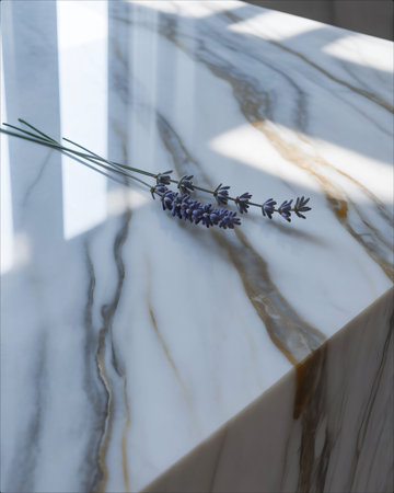 Three delicate lavender sprigs rest gracefully on a polished marble surface, bathed in natural sunlight that creates soft shadows and highlights the stones intricate patterns.