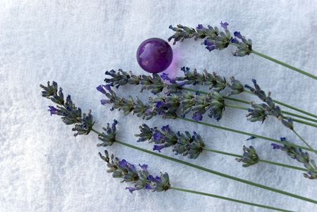 Beautiful lavender setting with crystals and flowers, perfect for aromatherapy and relaxation themes.