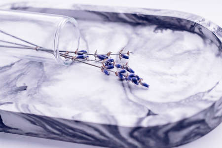 Lavender flowers on grey and white marble background. Lavender bouquet, marble tray. Copy space.