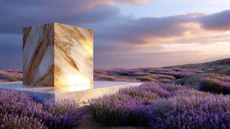 A white cube with a gold border is sitting on a platform in a field of purple flowers. The scene is serene and peaceful, with the flowers providing a calming backdrop to the cube