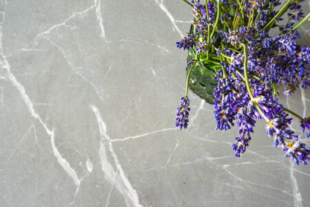 Bouquet of lavender flowers lying on a marble background. Flowering flowers, a symbol of spring, new life. A joyful time of nature awakening to life.