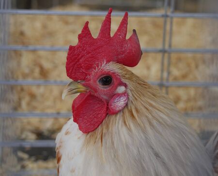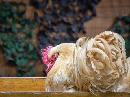 Rooster, hen on private farm in chicken coop close-up. Comb and beak. Poultry farming and agriculture. Pure bred. . High quality photo