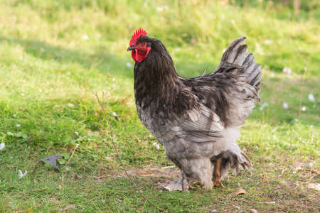 Cute chicken walks on a green lawn in the park, beautiful bird