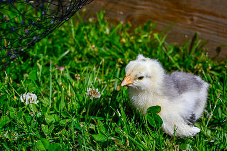 yellow and grey little chicken walking in grass