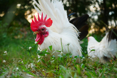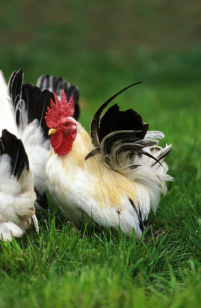 Pekin Bantam, Chickens breed Dwarf Cochin. Poultry on a farm or barnyard. The concept of agriculture, harvesting and breeding birds. White and black cochin roosters with hens on farm, poultry bird with comb.