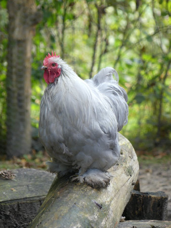 Fluffy white silkie farm chicken, looking fabulous, selective focus
