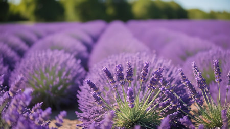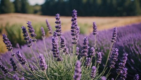 Lavender flowers sway gently in the warm summer breeze, creating a vibrant purple tapestry that perfumes the countryside with a soothing scent.