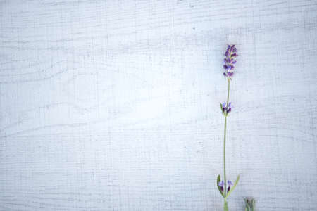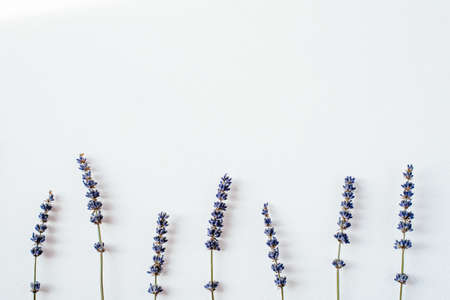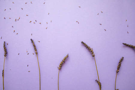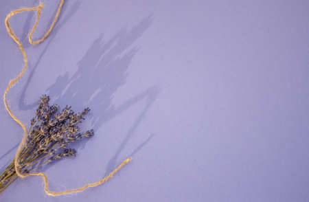 violet lavender flowers arranged on bright blue background. Top view, flat lay. Minimal concept. Dry flower floral composition. Pastel colors.