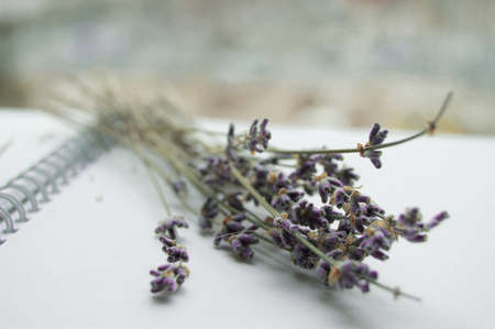 Lavender bouquet on an open notebook, selective focus, romantic card, mock-up for the design and decoration of the theme of romance and love.