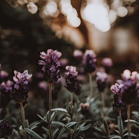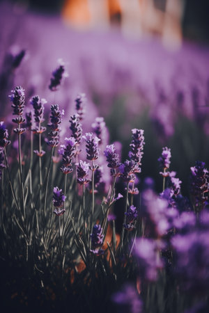 This image showcases vibrant lavender flowers in full bloom. The composition features a shallow depth of field, with soft focus in the background and foreground elements. Warm tones and natural lighting enhance the scene's aesthetic appeal, suggesting a tranquil and organic environment, well-suited for various visual applications.