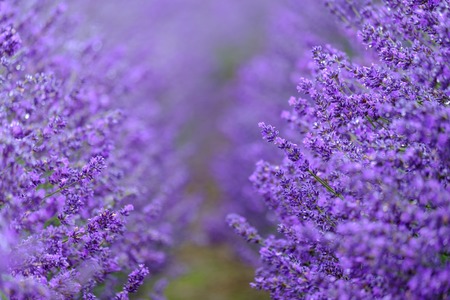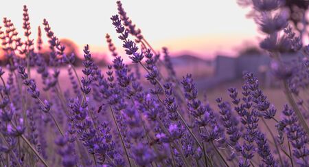 Close up Lavender flower blooming scented fields in endless rows on sunset. Selective focus on Bushes of lavender purple aromatic flowers at lavender fields Abstract blur for background.