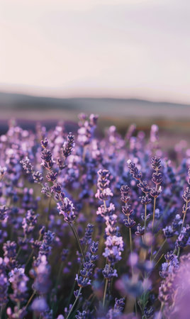 A serene lavender field bathed in gentle light creates a calming atmosphere. The delicate purple blooms evoke tranquility, perfect for nature lovers and wellness themes.