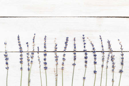 Aromatic dried herbarium of lavender flowers with selective focus and copy space for text or lettering.