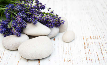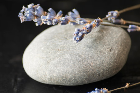 Spa stones with dried lavender flowers.