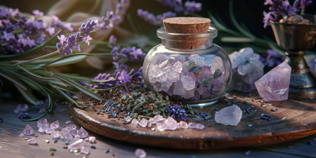 Lavender crystals and herbs are arranged on a table to create a serene atmosphere, promoting wellness and tranquility