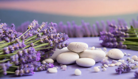 Spa still life with lavender flowers and white stones on violet background