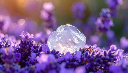 A translucent, glowing crystal rests gently upon a bed of vibrant purple lavender flowers.