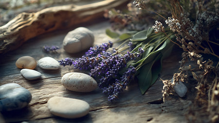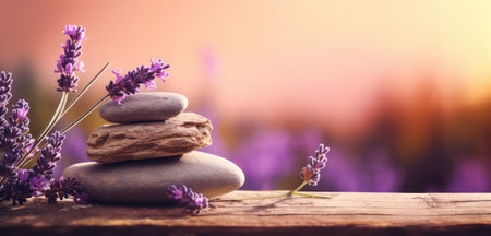 A tranquil arrangement of zen stones and fresh lavender flowers on a wooden surface against a blurred natural backdrop