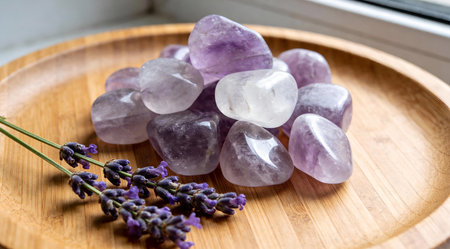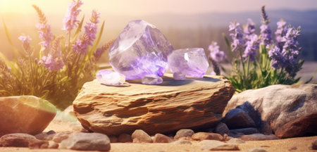 Beautiful lavender setting with crystals and flowers, perfect for aromatherapy and relaxation themes.