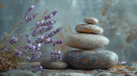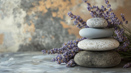 A stack of smooth stones surrounded by fragrant lavender flowers on a textured surface for a calming atmosphere